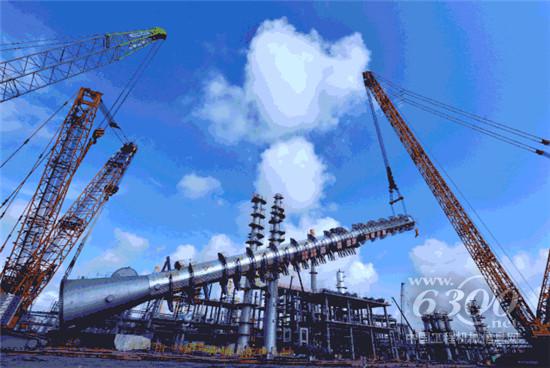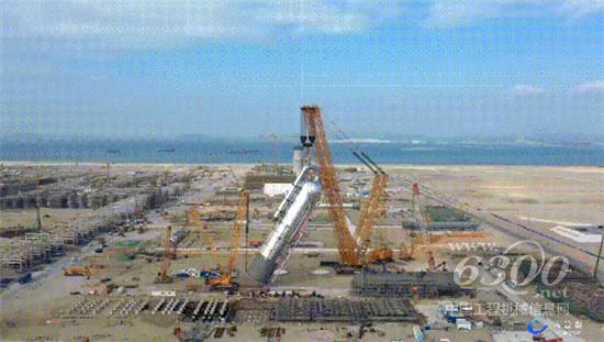 中科炼化一体化项目最大设备(乙烯2号丙烯塔)建设安装现场,“世界第一吊”挑战海岛炼化项目设备体积最大、高度最高,吊装难度最大、吊装要求也最高的千吨级乙烯2号丙烯塔吊装。
