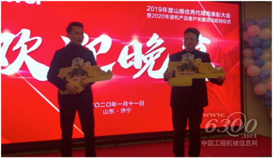 近日,在2020年山推道机产品客户关爱活动启动仪式相关活动中,山推四川客户汪老板、陕西客户侯老板在砸金蛋的抽奖环节中一举斩获山推装载机大奖!山推股份总经理张民亲自交付钥匙,并与获奖嘉宾合影留念。