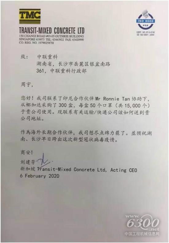 受新冠肺炎疫情影响,新加坡当地的医疗防护物资也已变得紧俏。为了能够采购到更多物资,TMC公司联系其印尼合作伙伴进行协助,经过多方努力最终采购到1.5万只口罩并火速发运至长沙。2020年1月,TMC公司CEO刘建芳曾来到长沙,首次参加了中联重科2019年度总结表彰大会。中联重科马来西亚国家经理曹栋介绍道:“TMC公司是我们的VIP客户,CEO刘建芳亲临长沙并观看了中联重科的年会。会后,他对年会给予了极高地评价,并特地来信称赞。”感谢信中,刘建芳对中联重科年会高度赞赏,他表示非常荣幸受邀参加这场中联人的联欢盛会,整个大会的节目策划和演出展现了中联重科策划人员超凡的工作水平,中联重科董事长詹纯新清晰务实的发言、出色的交响乐演奏、精彩的芭蕾舞表演都让他印象深刻。信中,他预祝中国早日战胜新冠肺炎疫情。