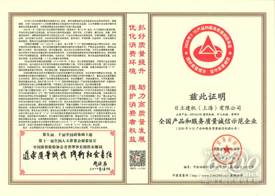 日立建机获2020全国产品和服务质量诚信示范企业