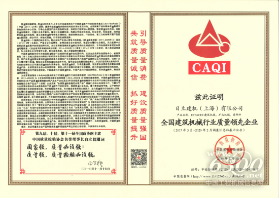 日立建机获2020全国建筑机械行业质量领先企业