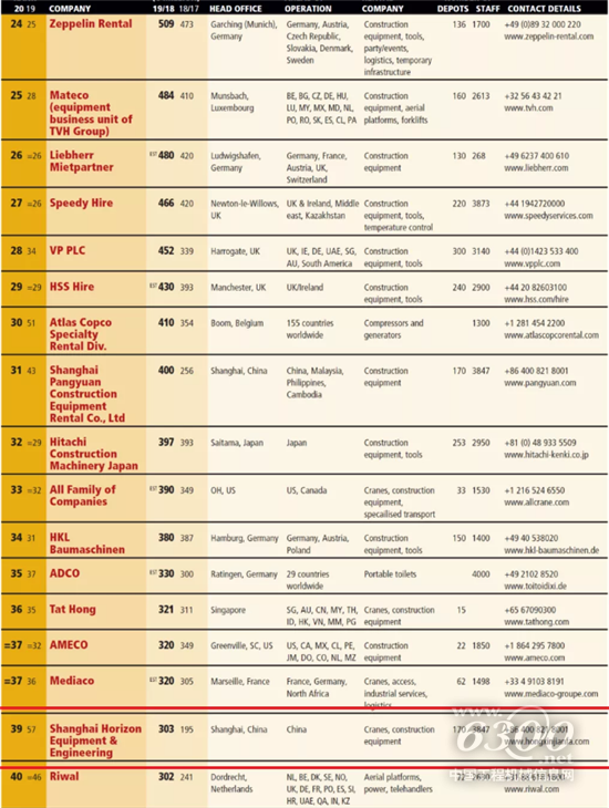 值得注意的是,今年的增长排行榜上有两家中国租赁公司。上海庞源建筑设备租赁公司(Pangyuan)的收入增长56%,2019年是4亿欧元,在排行榜上排名第31位,在中国、马来西亚、菲律宾和柬埔寨设有包括近6000台塔式起重机的机队。上海宏信建设发展有限公司的收入增长了55%,相较于2019年IRN100排名上升18位,达到全球第39位,再创新高。
