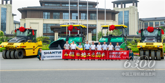 6月13日,山推成套路面产品交机仪式在河南举行,交付的设备包含数台SR30T-3胶轮压路机和SRP90S摊铺机,山推股份副总经理魏相圣出席并将钥匙交付给客户。营销公司、河南片区,河南山推等单位相关负责人共同参加。