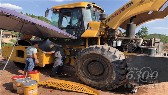 烈日炎炎,在成都一处工地上,3台山推SR26-3压路机正在同时施工;施工间隙山推服务人员对设备进行了免费巡检维护,对现场工作人员详细询问设备使用情况并解答他们的问题。