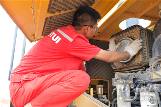 正在此地施工的工程公司拥有8台山推设备,看到山推服务团队一行人到来,管理设备的秦经理热情地迎了上来,然而服务工程师们并没有因为客户的热情放松下来,寒暄过后就直奔设备开始保养工作。看着一行人忙碌的身影,秦经理感慨颇多:“山推设备出勤率高、故障率低、使用成本低、服务及时、到位,真的就像那句口号说的一样,让施工更简单。”
