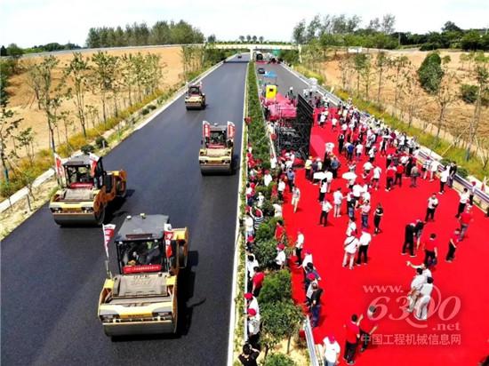 在智能压实辅助系统的控制下,2台30吨级轮胎压路机SPR300C-8、5台13吨级的双钢轮压路机STR130C-8来回压实、平整路面,作业效率获现场观众的一致认可。