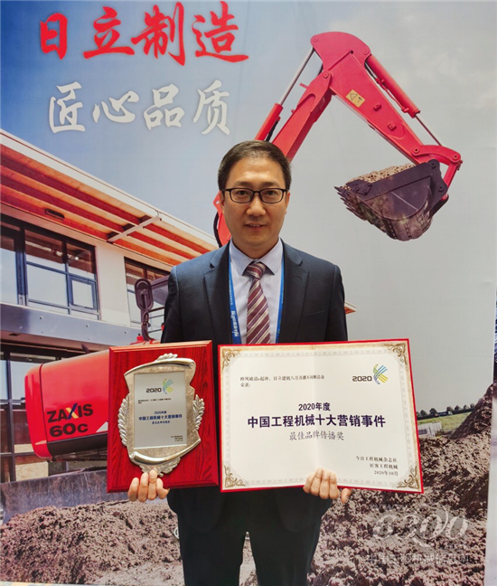 2020年10月28日,一年一度的中国工程机械营销暨后市场大会在安徽合肥举办。日立建机(上海)有限公司(以下简称HCS)产品支援事业部事业部长金庆应邀出席高峰对话,与各方代表共同聚焦行业热点和发展方向。大会还评选出了2020年度中国工程机械十大营销事件,HCS开展的“橙风破浪e起冲,八月直播不间断”活动荣誉上榜,这也是HCS连续第三年摘得年度营销大奖,HCS新机运营部部长徐永强登台领奖。