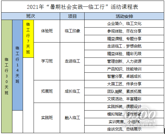 报名时间:请及时提交实习人员信息和实习要求,避免与其他院校时间冲突,工厂“临工行”实习活动实行报备制度,我们将根据报名顺序安排“临工行”实习活动时间,采用“先报先得”的原则。