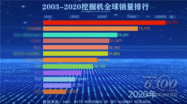 2018年,三一挖掘机销量跻身全球第四;2019年成为全球第二;2020年,三一挖掘机全球销量98705台,占据全球挖掘机市场15%的份额,成功登顶!
