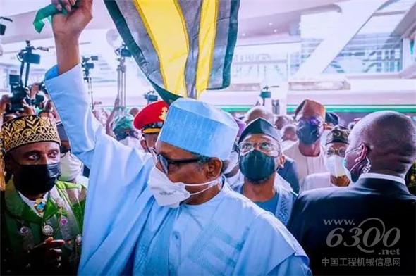 图丨布哈里总统挥舞旗帜庆祝铁路开通