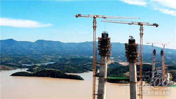 两岸主塔已施工过半,徐工塔机随着主塔施工节节升高,通过载荷自适应控制技术,实现自动识别、自动控制、轻载高速、重载低速,保证项目各项工作高效推进。