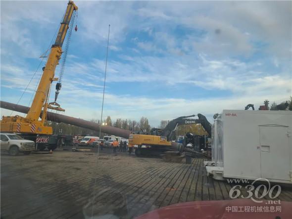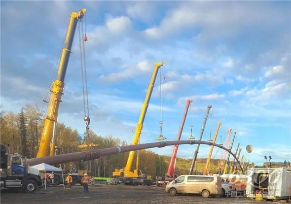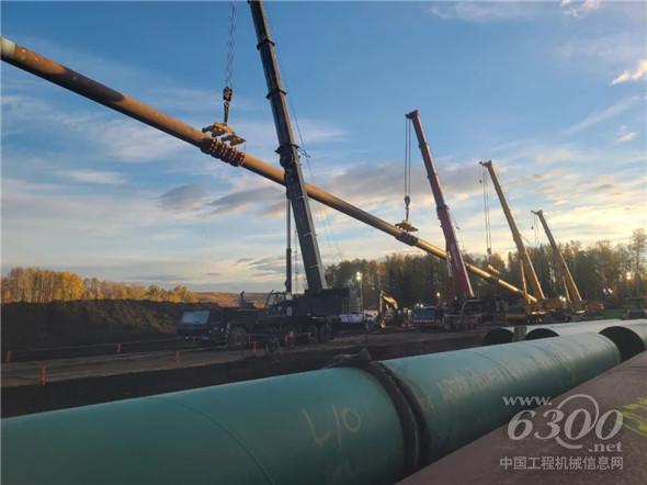 近日,在加拿大Grande Prairie市石油天然气管道铺设项目现场,随着现场指挥员一声号令,徐工XCA275U与一排的利勃海尔、马尼托瓦克大吨位起重机组成联合施工集群,合力高举,缓缓下落,绵延数百米远的天然气管道被放置到指定位置。