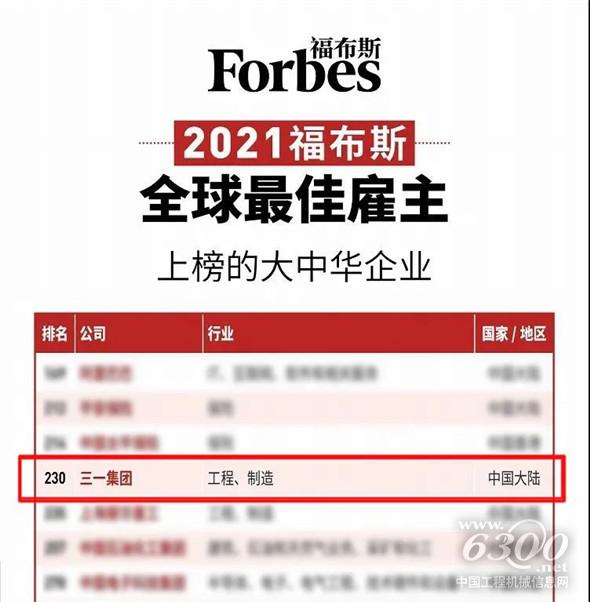 近日,福布斯发布2021全球最佳雇主榜,三一集团位列大中华区第10、全球第230位。