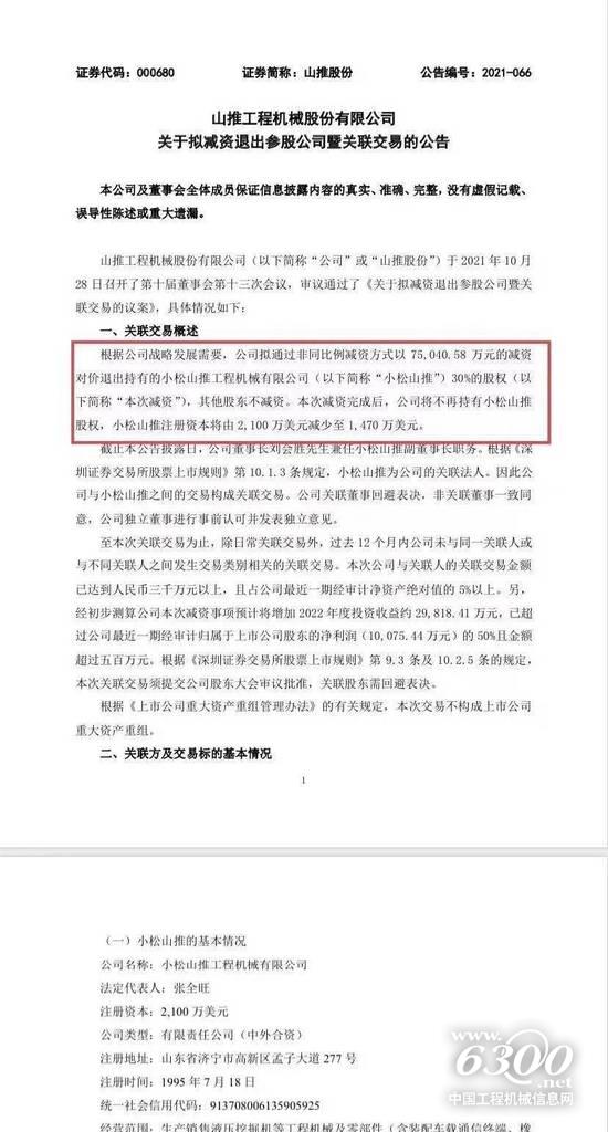 山推股份日前公告称,根据公司战略发展需要,公司拟通过非同比例减资方式,以7.50亿元的减资对价,退出持有的小松山推工程机械有限公司30%的股权,其他股东不减资。本次减资完成后,公司将不再持有小松山推股权,小松山推注册资本将由2100万美元减少至1470万美元。