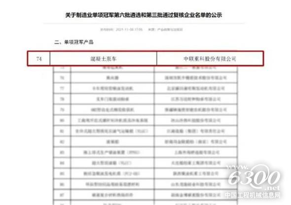 11月8日,工信部公示了拟认定的第六批制造业单项冠军和拟通过复核的第三批制造业单项冠军名单,中联重科混凝土泵车入选第六批国家级制造业单项冠军产品。这是继塔机、履带起重机产品之后,中联重科又一高端产品类别获此殊荣,再度展现了中联重科在混凝土机械制造领域的领军实力。
