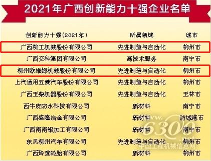 柳工入选2021年广西高新技术企业百强、创新能力十强!