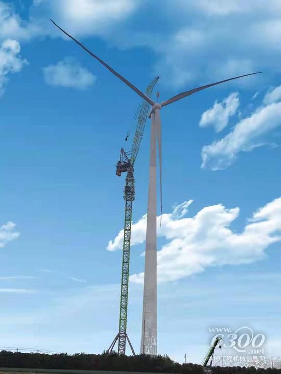 △中联重科生产制造的全球最大风电动臂塔机正在作业