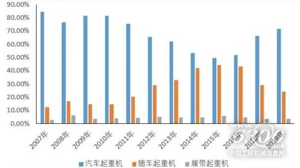 移动式起重机主要包括随车、汽车、轮胎、全球路面起重机和履带起重机。