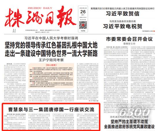 4月25日,株洲市委书记曹慧泉与三一集团总裁唐修国一行座谈,就加快推进项目建设、拓宽合作领域等深入交流。