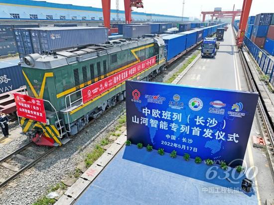 5月17日上午11点半,随着一阵火车鸣笛声,搭载着山河智能制造的近五百台挖掘机和滑移装载机的中欧班列(长沙)山河智能专列,从长沙出发,启程前往欧洲。