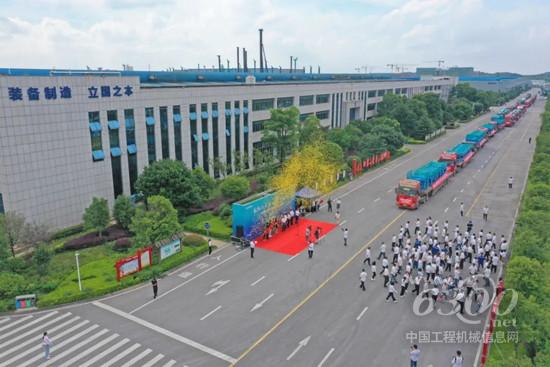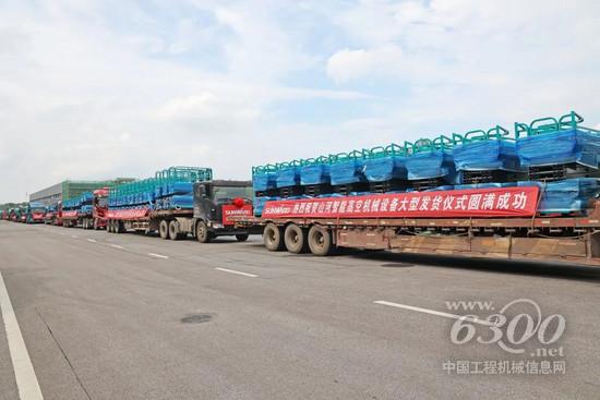 “发车!”伴随着礼炮和激昂的音乐,满载着近300台“山河绿”高空机械设备的20余辆货车从山河大道驶出,发往全国20多个省市以及欧洲、俄罗斯、越南、柬埔寨等10多个国家和地区……