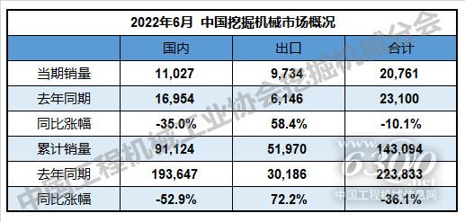 2022年6月挖掘机国内销量11027台,同比下降35%