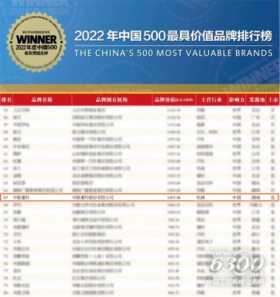 7月26日,由世界品牌实验室(World Brand Lab)主办的第十九届“世界品牌大会”在北京举行,会上发布了2022年《中国500最具价值品牌》分析报告。中联重科以1007.58亿元品牌价值上榜,较去年大幅提升141.83亿元。这是中联重科连续19年荣登《中国500最具价值品牌》榜,并突破千亿元大关,既充分彰显了中联重科持续攀升的品牌影响力,也极致凸显了中联重科作为我国装备制造龙头企业的品牌引领力。