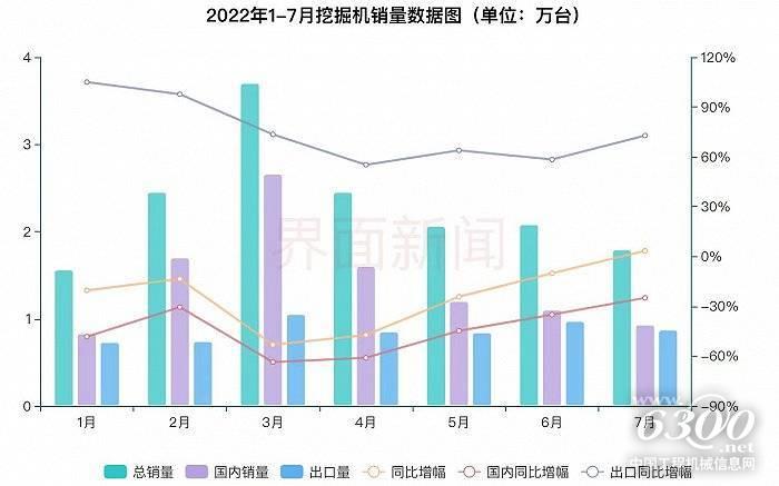1-7月,26家挖掘机制造企业共销售挖掘机16.1万台,同比下降33.2%;其中国内10.04万台,同比下降51.3%;出口6.07万台,同比增长72.3%。