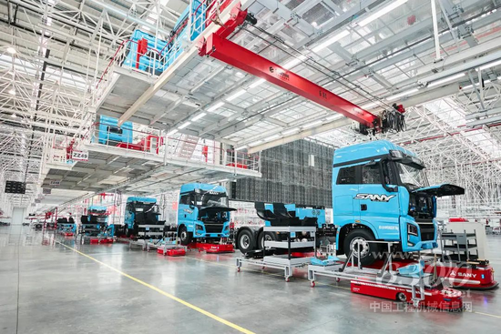AGV小车来回穿梭,工业机器人举重若轻,机械臂灵活舞动,充斥着力量和机械美感,通过冲压、焊装、涂装、总装四大生产工艺,平均每4分钟就下线一台重卡。