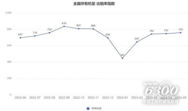 2023年5月升降工作平台出租率为759点,环比略涨1.6%,较2022年同期增长8.3%。其中≤6m、8m-12m剪叉平台平均出租率超过80%,≤6m剪叉平台出租率已达到83.5%,与2022年同期相比提高了18.1%;14-16m和36-39m臂架式平台环比出租率处于下降状态,其中36-39m机型出租率环比下降10.8%;20-24m和30-35m臂架式平台环比出租率基本持平。2023年5月与2022年同期相比,所有机型出租率均处于上升趋势。(出租率是以台天数为基准进行计算,100%出租率对应1000点。)