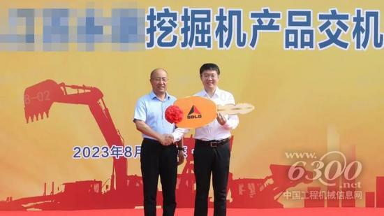 在欢快的乐曲和热烈的掌声中,史总向曹总交付了象征友谊与财富的挖掘机“金钥匙”。