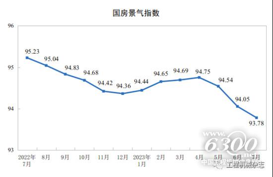 房地产消费需求及信心尚不足,恢复有待时日,叠加土地购置费及房屋新开工面积下滑,房地产行业以“保交楼”和“去库存”为主,投资短期内难以有效提振。2023年1—7月,全国房地产开发投资67717亿元,同比下降8.5%。1—7月,房地产开发企业房屋施工面积799682万平方米,同比下降6.8%。房屋新开工面积56969万平方米,下降24.5%。2023年7月,房地产开发景气指数为93.78,持续下降。