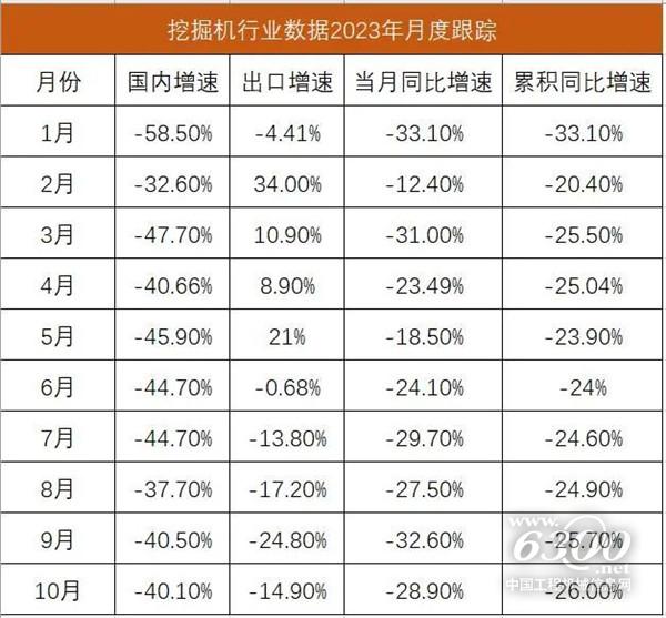 据中国工程机械工业协会,今年 10 月,挖机行业销量 14584 台,同比 -28.9%,国内 6796 台,同比 -40.1%;出口 7788 台,同比 -14.9%。2023 年 1-10 月,挖机行业累计销量 163396 台,同比 -26%;其中国内 74871 台,同比 -43%; 出口 88525 台,同比 -1.04%。