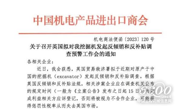 2023年11月13日,中国机电产品进出口商会发文称,英国贸易救济署拟于近期对原产于中国的挖掘机(excavator)发起反倾销和反补贴调查。