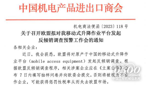 2023年11月8日,中国机电产品进出口商会的一则声明显示,欧盟将对原产于中国的移动式升降作业平台(mobile access equipment)发起反倾销调查......