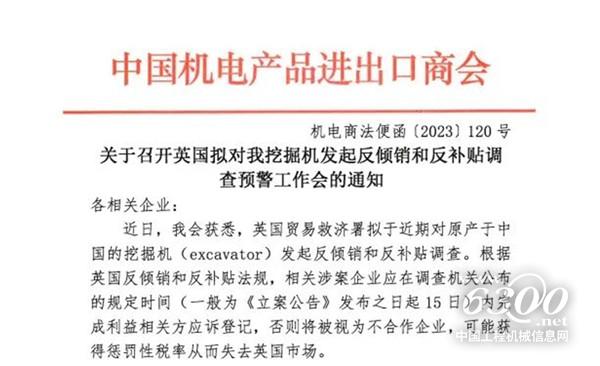 2.英国拟对我国挖掘机发起反倾销和反补贴调查;