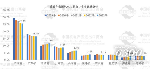 海关总署统计,2023年我国机电产品出口19786.6亿美元,占我国货物出口总额的58.5%。内地31个省、自治区、直辖市的全年机电外贸统计数据已出炉,广东省、江苏省、浙江省、上海市分别连续五年列全国机电出口省市前四位,合计比重超六成。