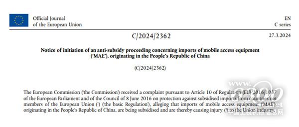 2024年3月27日,欧委会发布公告,决定对原产于中国的移动式升降作业平台整机和成套散件产品(mobile access equipment, the pre-assembled or ready-to-assemble sections of mobile access equipment)发起反补贴调查。