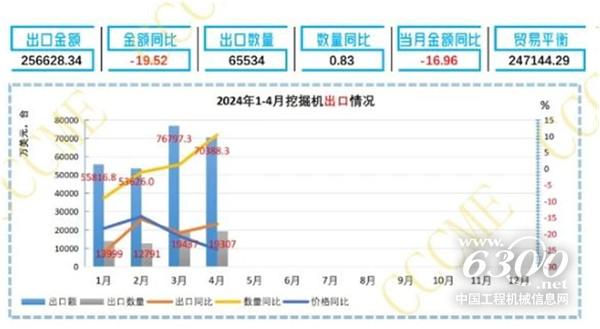 1-4月,我国挖掘机进出口总额26.6亿美元,进出口金额同比下降18.3%。其中:出口25.7亿美元,同比下降19.5%;进口0.9亿美元,同比增长41.4%。贸易顺差24.7亿美元,需求不振仍未改善。其中出口方面已是同比连续10个月下降,俄罗斯、比利时、沙特、印尼等份额较大的市场需求状况仍未改善。
