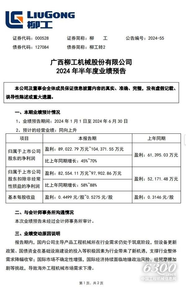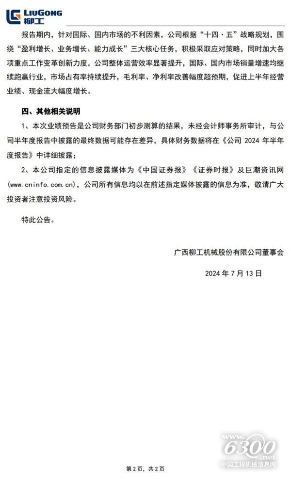 本次业绩预告是柳工财务部门初步测算的结果,未经会计师事务所审计,与柳工半年度报告中披露的最终数据可能存在差异,具体财务数据将在《柳工 2024 年半年度报告》中详细披露。