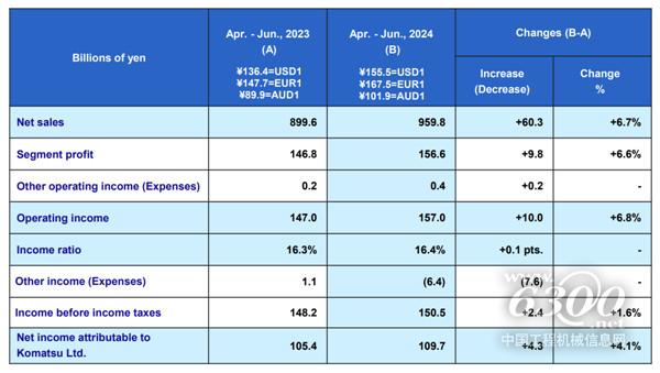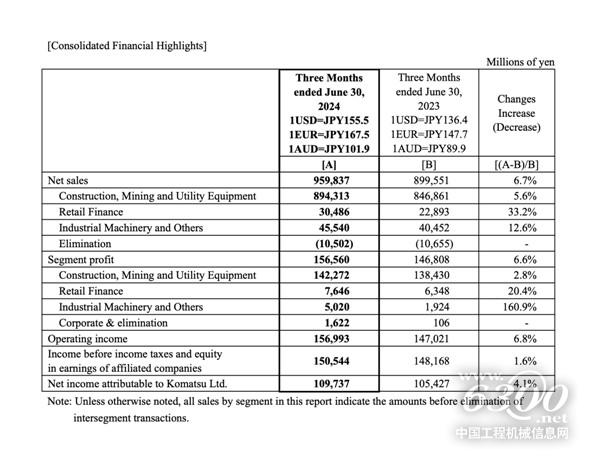 按业务板块看:工程机械、采矿和公用事业设备:销售额较2023年同期增长5.6%,达到8943亿日元;净利润增长2.8%至1423亿日元。零售金融:销售额比2023年同期增长33.2%,达到305亿日元;净利润增长20.4%至76亿日元。工业机械及其他:销售额较上年同期增长12.6%,达到455亿日元;净利润增长160.9%至50亿日元。小松方面表示,上述部门的销售额和净利润双增长主要是得益于日元贬值和设备销售价格增长。