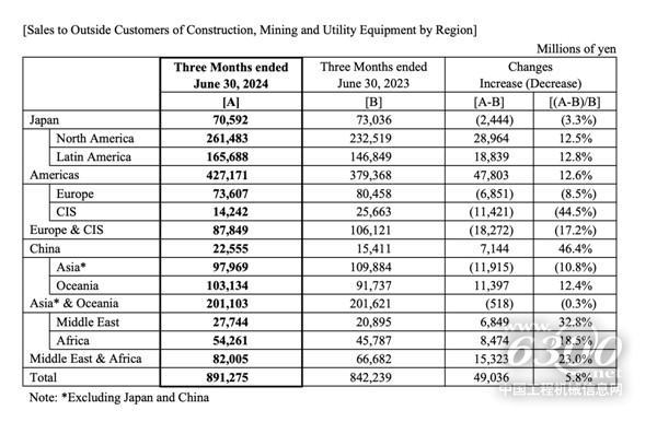 按区域看,报告期内工程机械、采矿和公用事业设备8912.3亿日元的总销售额主要由北美、拉丁美洲和大洋洲等市场贡献,而欧洲、独联体、亚洲等市场有所下降。