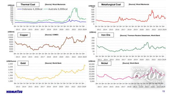 值得一提的是,小松在财报中还发布了主要矿产资源的价格走势。小松方面表示:尽管存在短期波动,但预计主要矿物的价格在长期内仍将保持在高位。其中,澳大利亚的动力煤价格将保持稳定,而印度尼西亚的动力煤将略有下降。由于中国市场需求下降,预计2024年冶金煤和铁矿石将温和下降。由于电动汽车的增长和对未来供需平衡的担忧,铜价将波动,预计2024年将保持在高位。