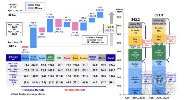 另外,亚洲市场销售额同比下降10.8%,主要原因是印度尼西亚的采矿设备销量下降和建筑设备需求疲软。然而,得益于零部件销量增加,中国市场销售额增长46.4%至225.55亿日元(2023年同期为154.11亿日元)。