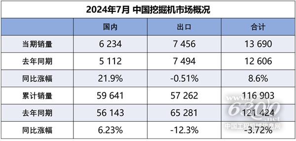 据中国工程机械工业协会对挖掘机主要制造企业统计,2024年7月销售各类挖掘机13690台,同比增长8.6%,其中国内6234台,同比增长21.9%;出口7456台,同比下降0.51%。