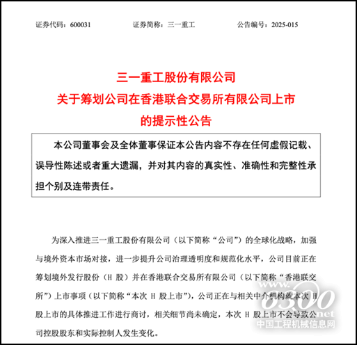 三一重工股份有限公司(三一重工)发布公告称,为深入推进全球化战略,加强与境外资本市场对接,进一步提升公司治理透明度和规范化水平,公司目前正在筹划境外发行股份(H股)并在香港联合交易所有限公司上市事项。据悉三一预计集资最多15亿美元(约116.7亿港元)。