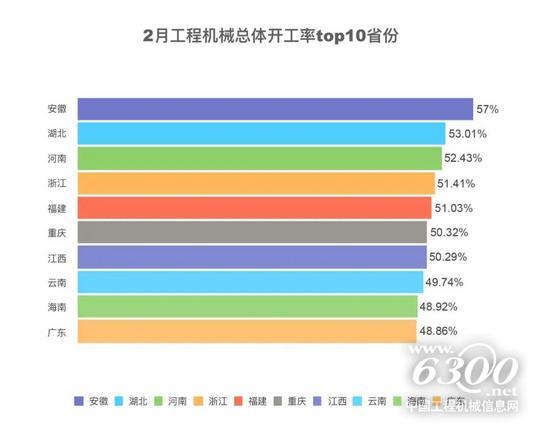 2月份,全国工程机械开工率为35.10%,安徽、湖北、河南、浙江、福建、重庆、江西开工率超50%。2月虽然处于春节假期,前10省份仍有近半数设备加班加点,基础建设呈现一片繁荣的景象。