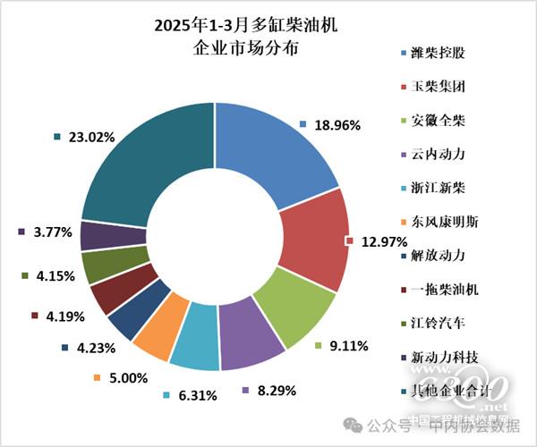 3月,多缸柴油机企业共销量44.33万台,环比增长29.46%,同比增长-0.59%;1-3月累计销量112.41万台,同比增长2.75%。潍柴、玉柴、全柴、云内、新柴、东康、解放动力、一拖(含扬动)、江铃、新动力科技销量居前十名,占多缸柴油机总销量的76.98%;市场份额占比中:潍柴18.96%、玉柴12.97%、全柴9.11%、云内8.29%、新柴6.31%、东康5.00%、解放动力4.23%、一拖4.19%、江铃4.15%、新动力科技3.77%。