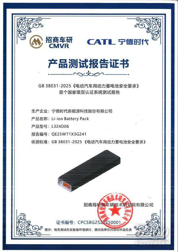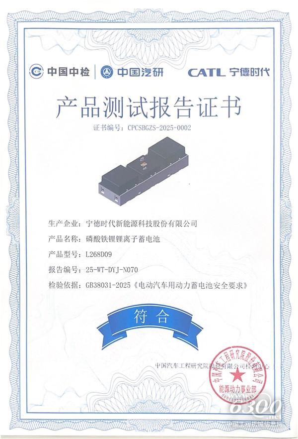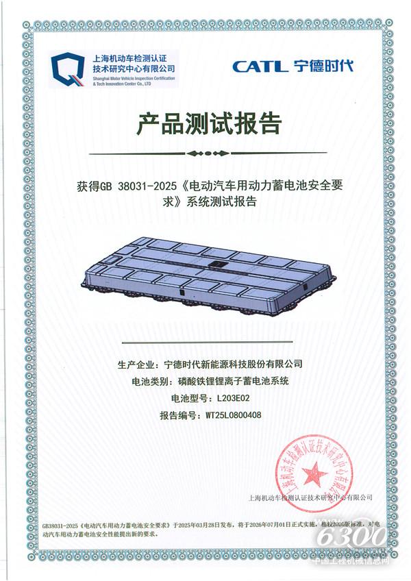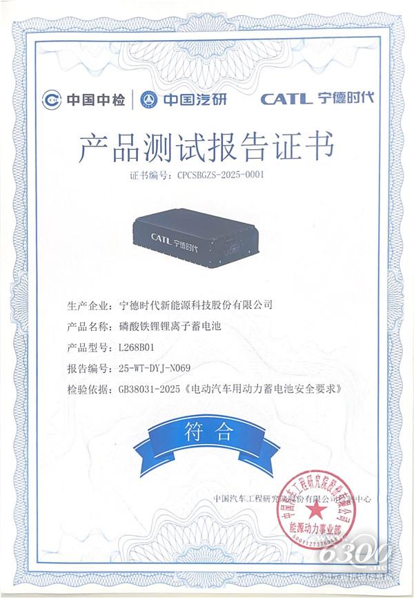 2025年5月7日,宁德时代天行B-客车系列、天行H-重型商用车系列与天行L-轻型商用车系列电池包分别在招商车研、中国汽研、上海机动车检测中心等权威第三方检测机构通过GB 38031-2025《电动汽车用动力蓄电池安全要求》(以下简称“新国标”)检测,成为国内首批满足该标准的商用动力电池,为商用车市场树立高安全标准新标杆。