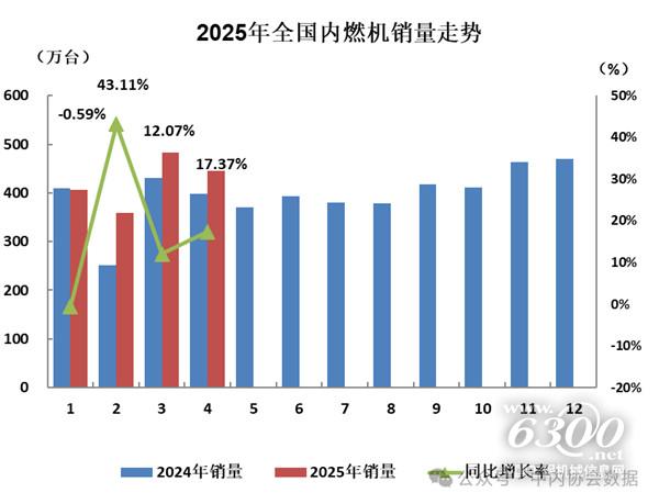 今年以来,我国经济呈现向好态势,社会信心持续提振,各种政策驱动下,内需潜力加快释放,内燃机整机市场较为活跃,销量同比及累计同比均呈增长态势。具体表现为:4月内燃机销量445.62万台,环比增长-7.88%,同比增长11.92%;1-4月累计销量1748.72万台,同比增长17.37%。